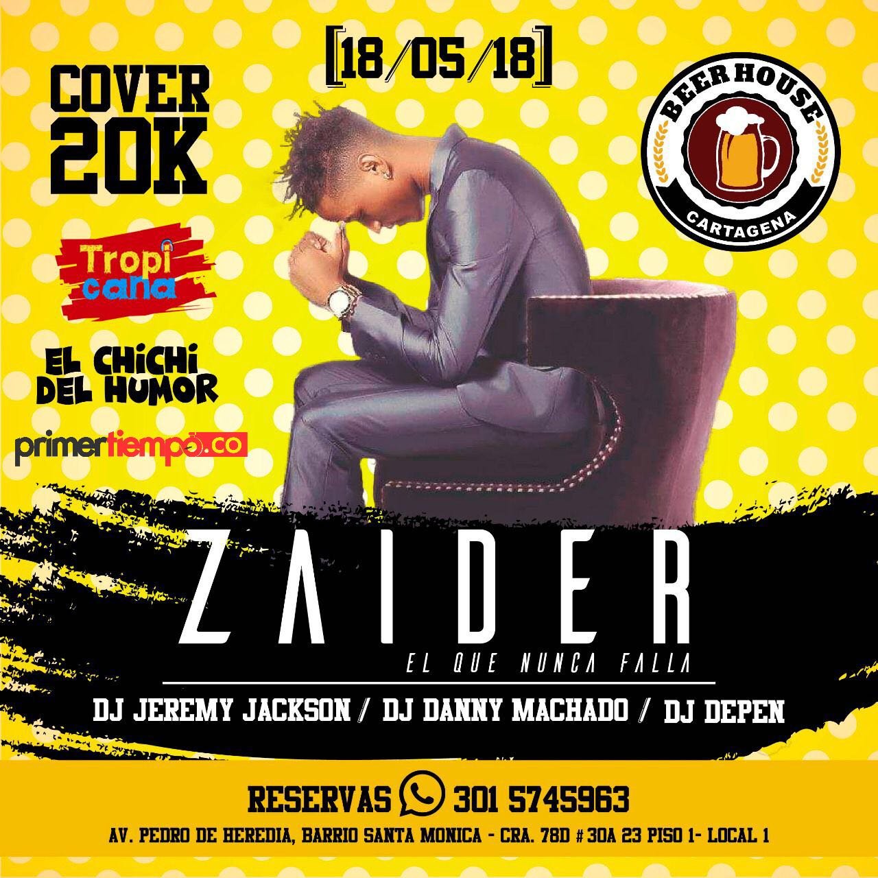 En el evento, apoyado por Tropicana y PrimerTiempo.CO, contará también con la presencia de El Chichi del humor y los Dj’s Jeremy Jackson, Danny Machado y Dj Depen. La boleta del evento se podrá conseguir a un costo de 20mil pesos comunicándose al 3015745963.