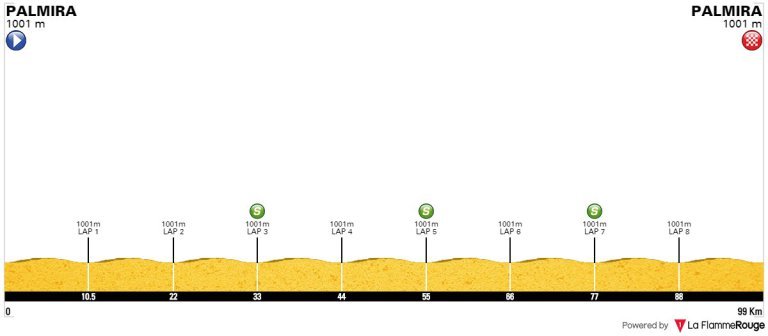 En esta primera etapa, un cicuito de 99 km en Palmira, los embaladores del pelotón se frotan las manos. Serán 9 giros, cada uno con 6 curvas pronunciadas y un giro en «U», que seguramente le pondrá los nervios de punta a más de uno. Aunque no disputen por ganar la etapa, lo técnico del recorrido hará que los favoritos al título presten mucha atención hoy.